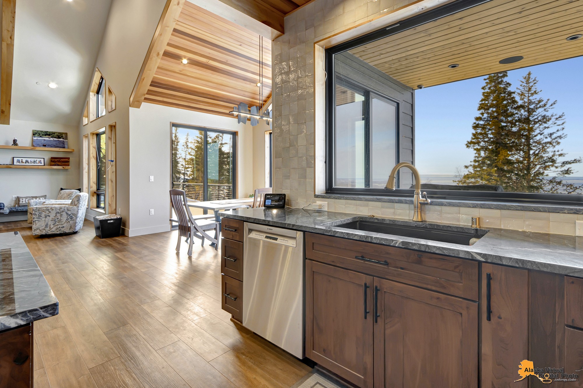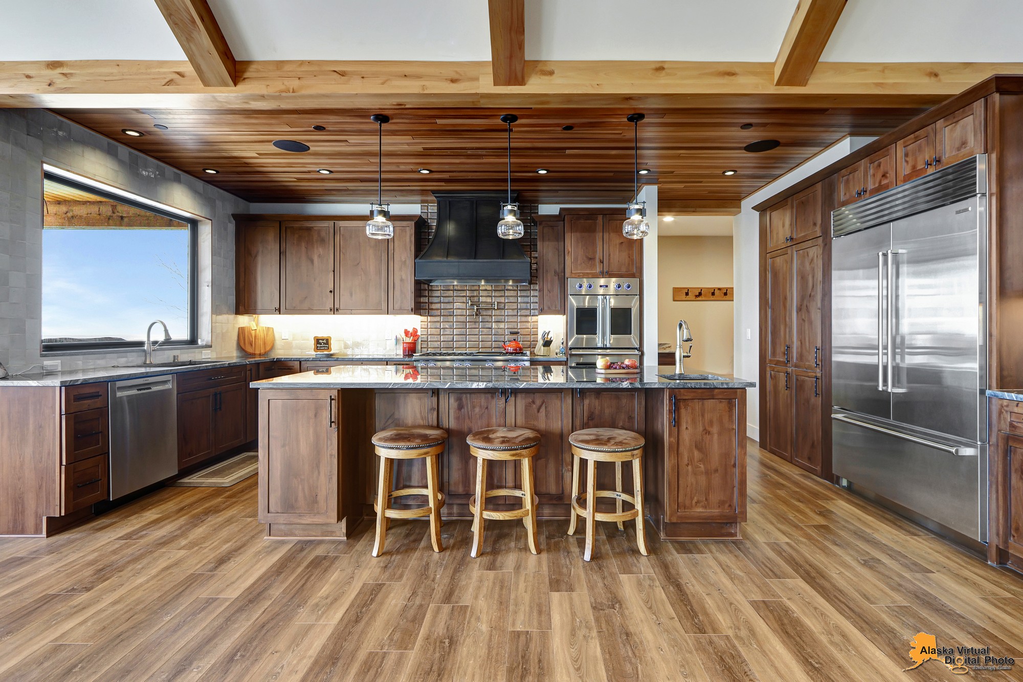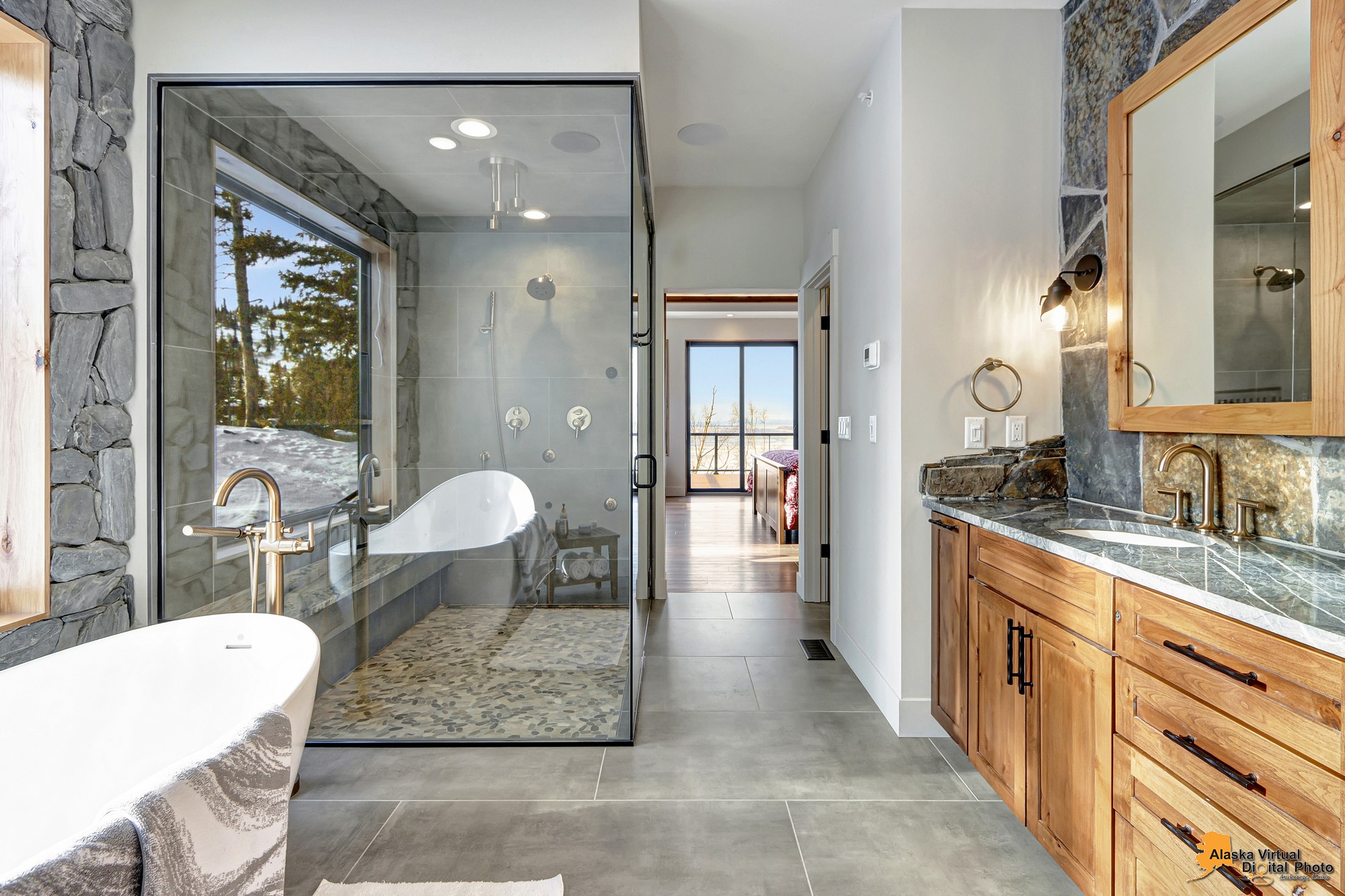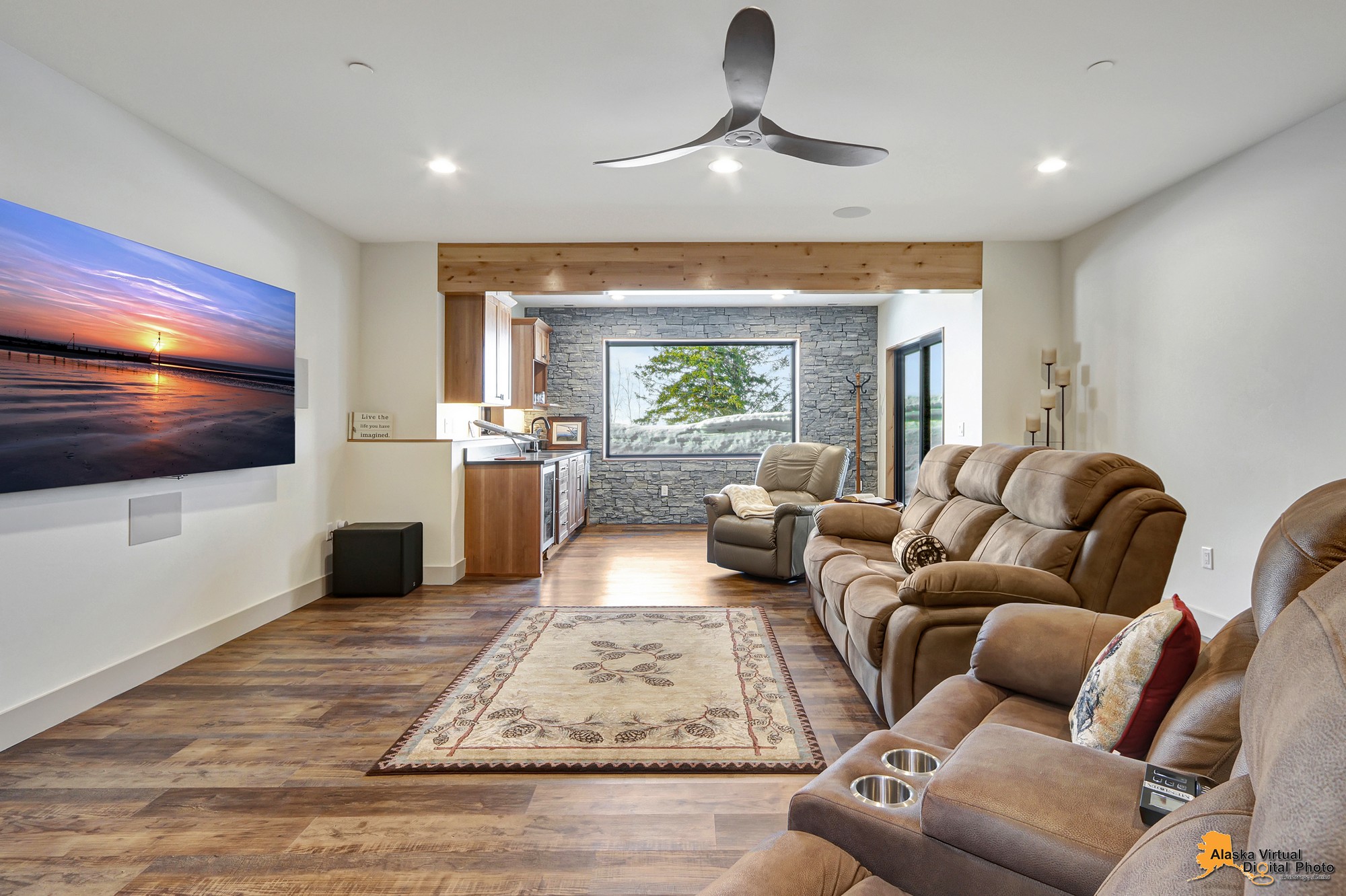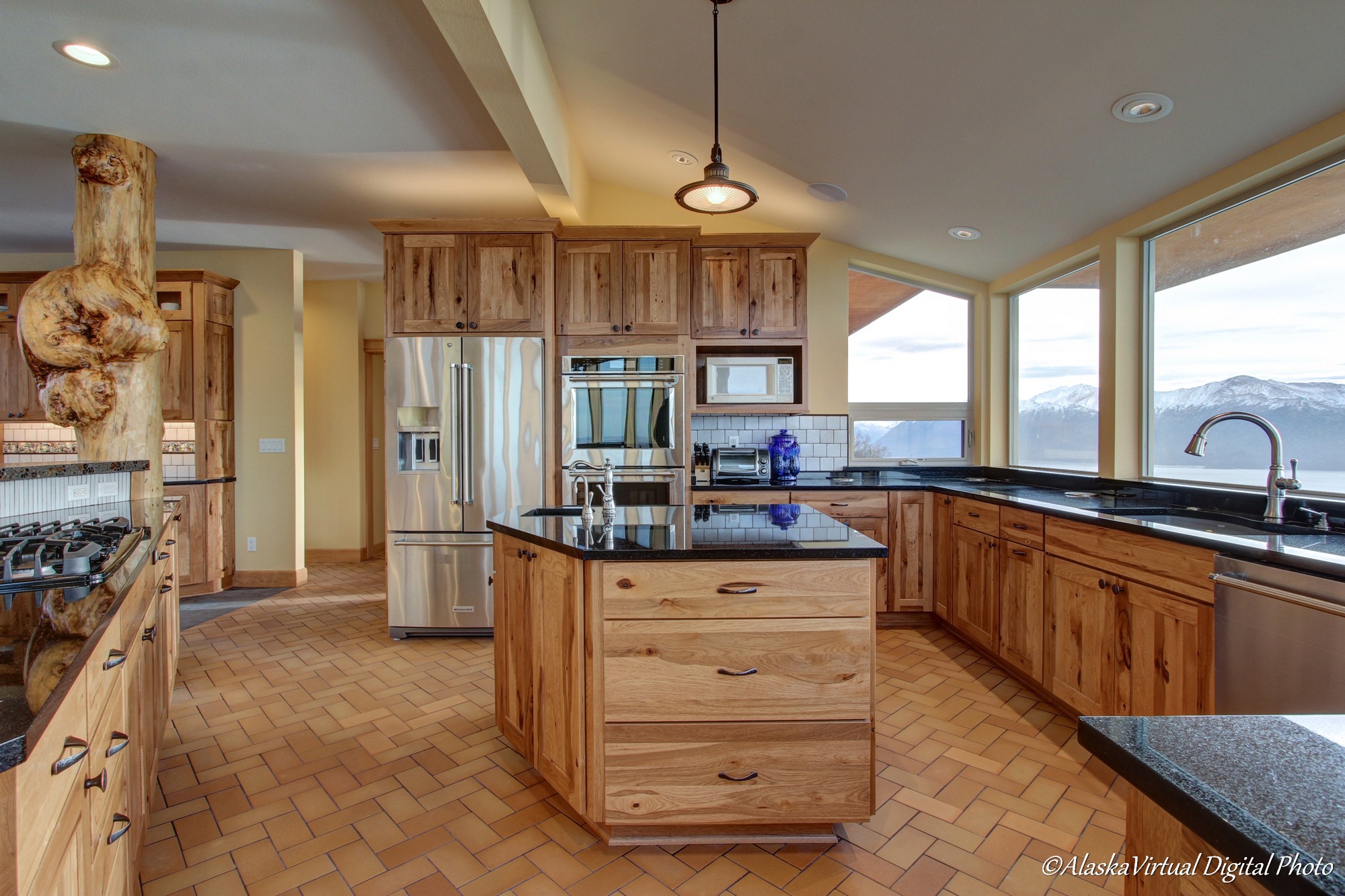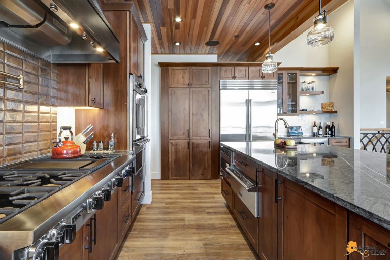 Local Stone Accents: Featuring real stone sourced from the historical goldmining town of Hope, AK, adding a piece of Alaskan history to every room.