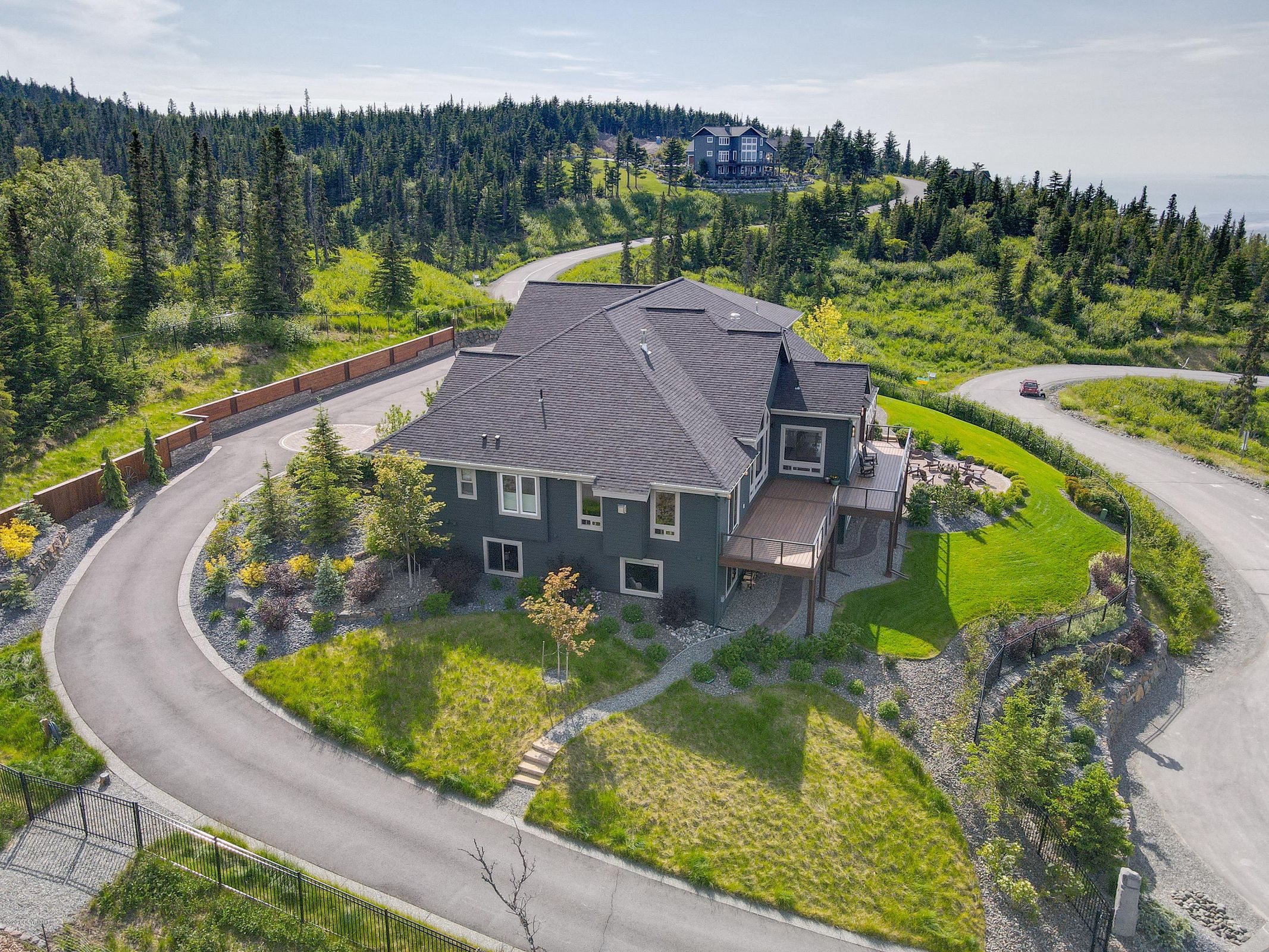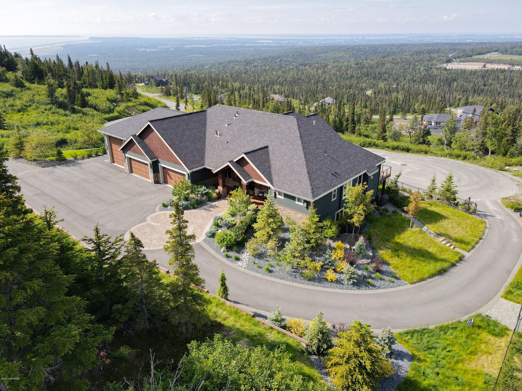 Inspired by a vision of retirement enveloped in nature's majesty, the original owners dreamt of a home where the wilderness meets luxury. Each aspect of the house was meticulously chosen to enhance the natural beauty surrounding it, ensuring panoramic views that include the Chugach Mountain Range, Kenai Peninsula, Alaska Range, and the iconic peaks of Mount Denali. The property offers a view comparable only to that from a plane approaching Anchorage, capturing the city lights of downtown and the serene landscapes that define Alaska.